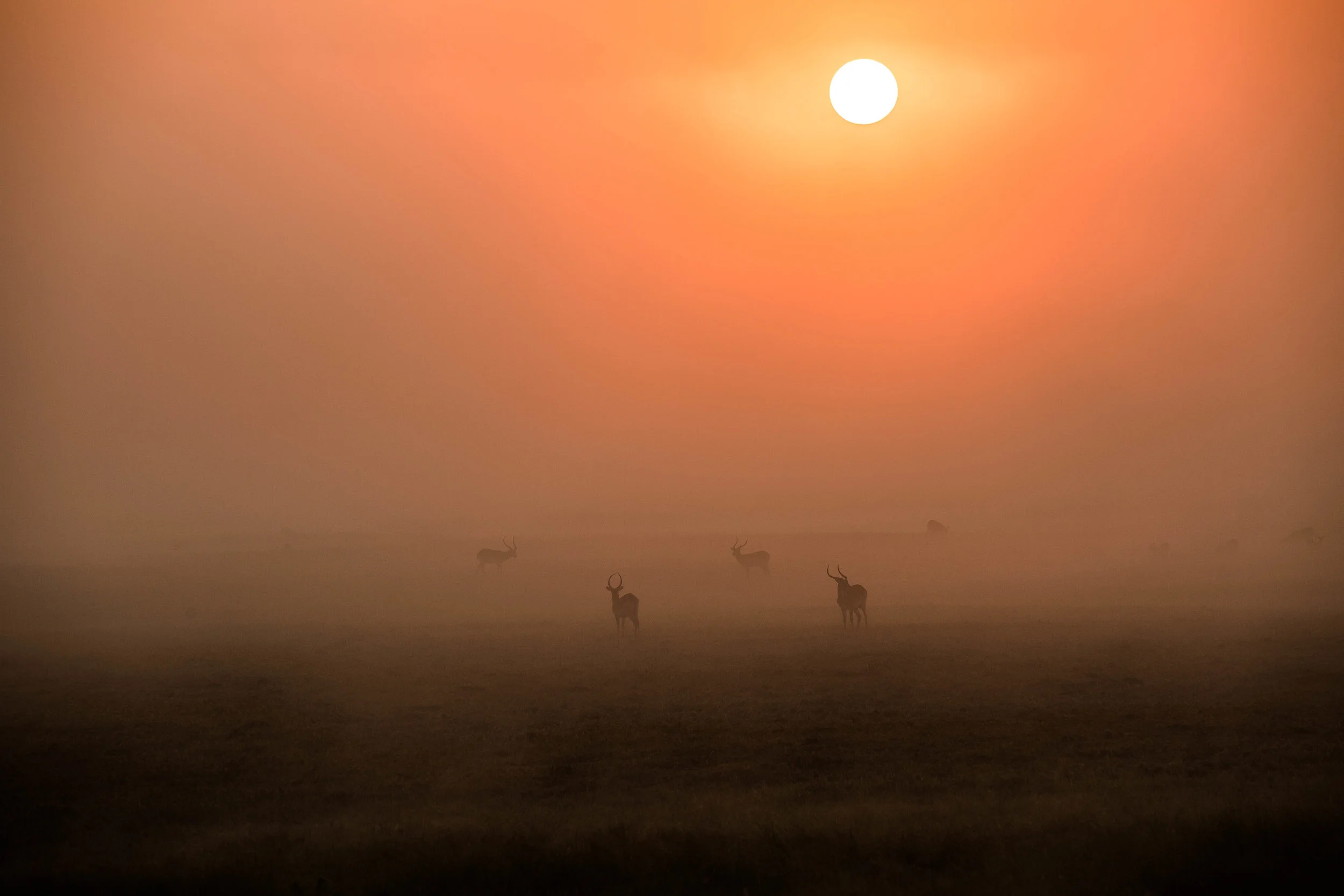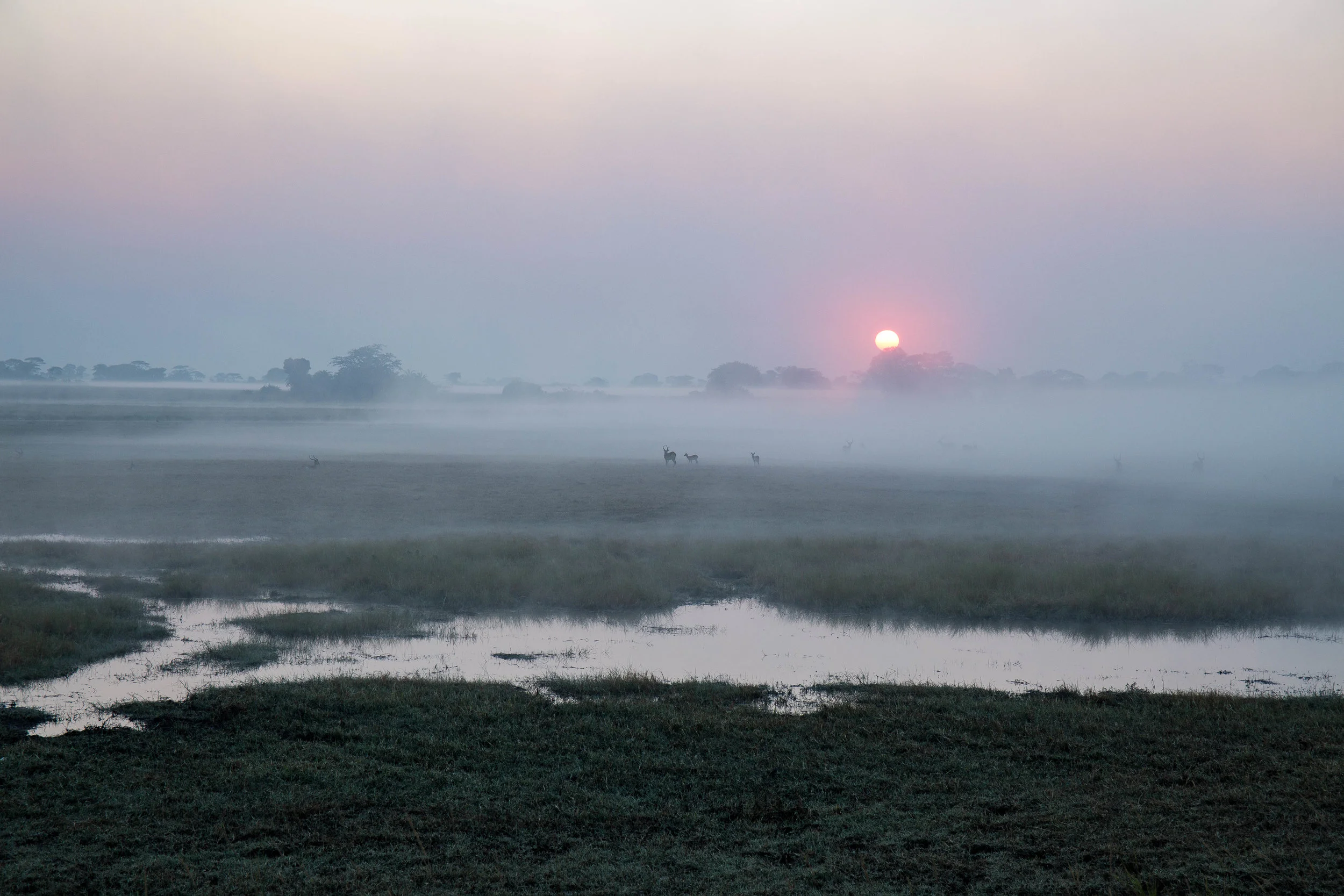 The Busanga Plains are heavy with mist this morning, and the grazing puku and lechwe are hazy silhouettes against the purple dawn. From our deck, we watch the shrouded plains come alive as antelope, buffalo and birds rouse from their slumber.